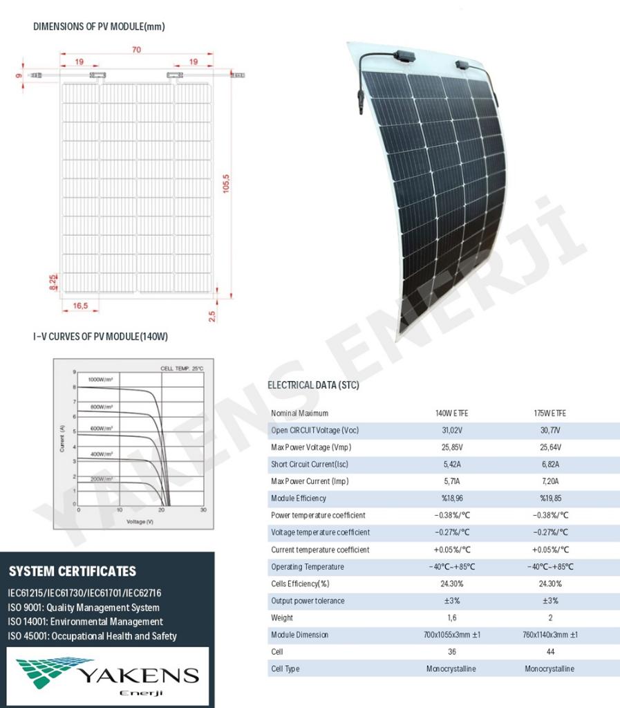 175 Watt ETFE Esnek Güneş Paneli Monokrsital Teknik Özellikler