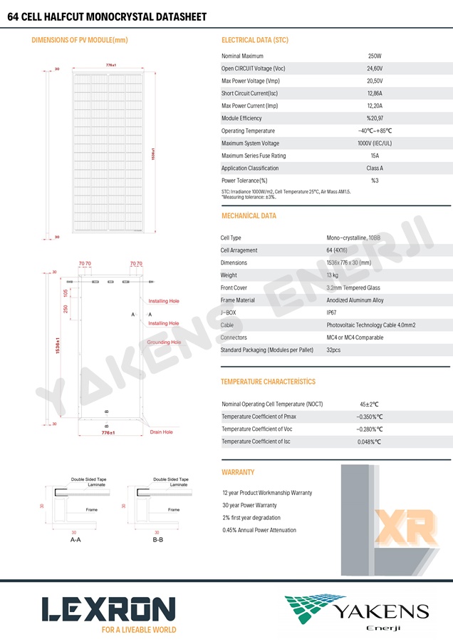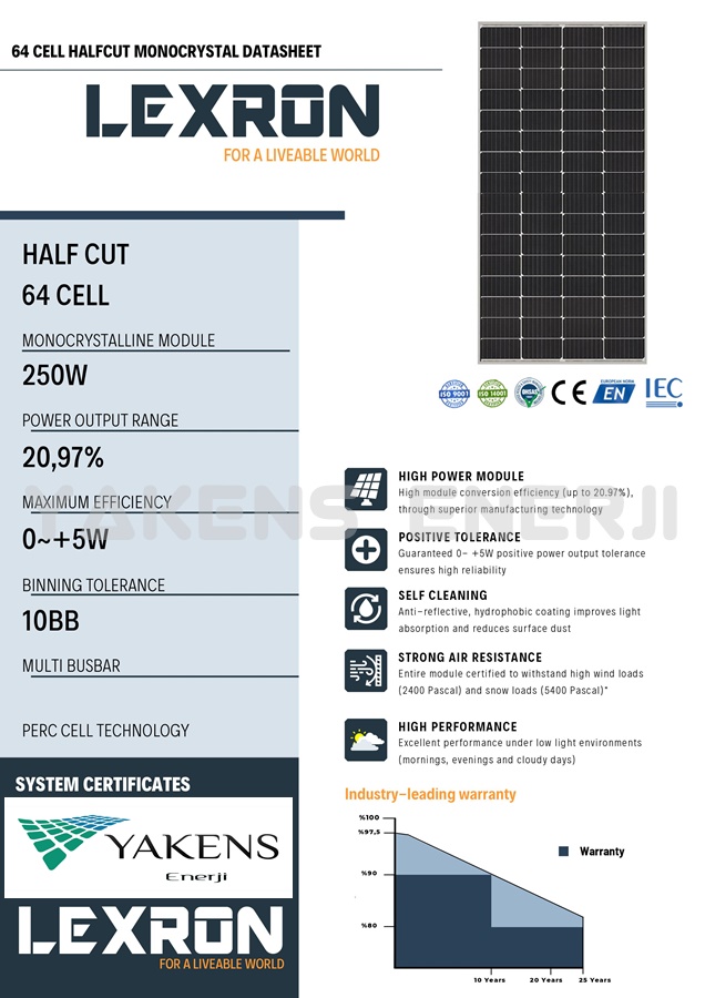 Lexron Half Cut 250 Watt Monokristal Solar Panel Teknik Özellikleri