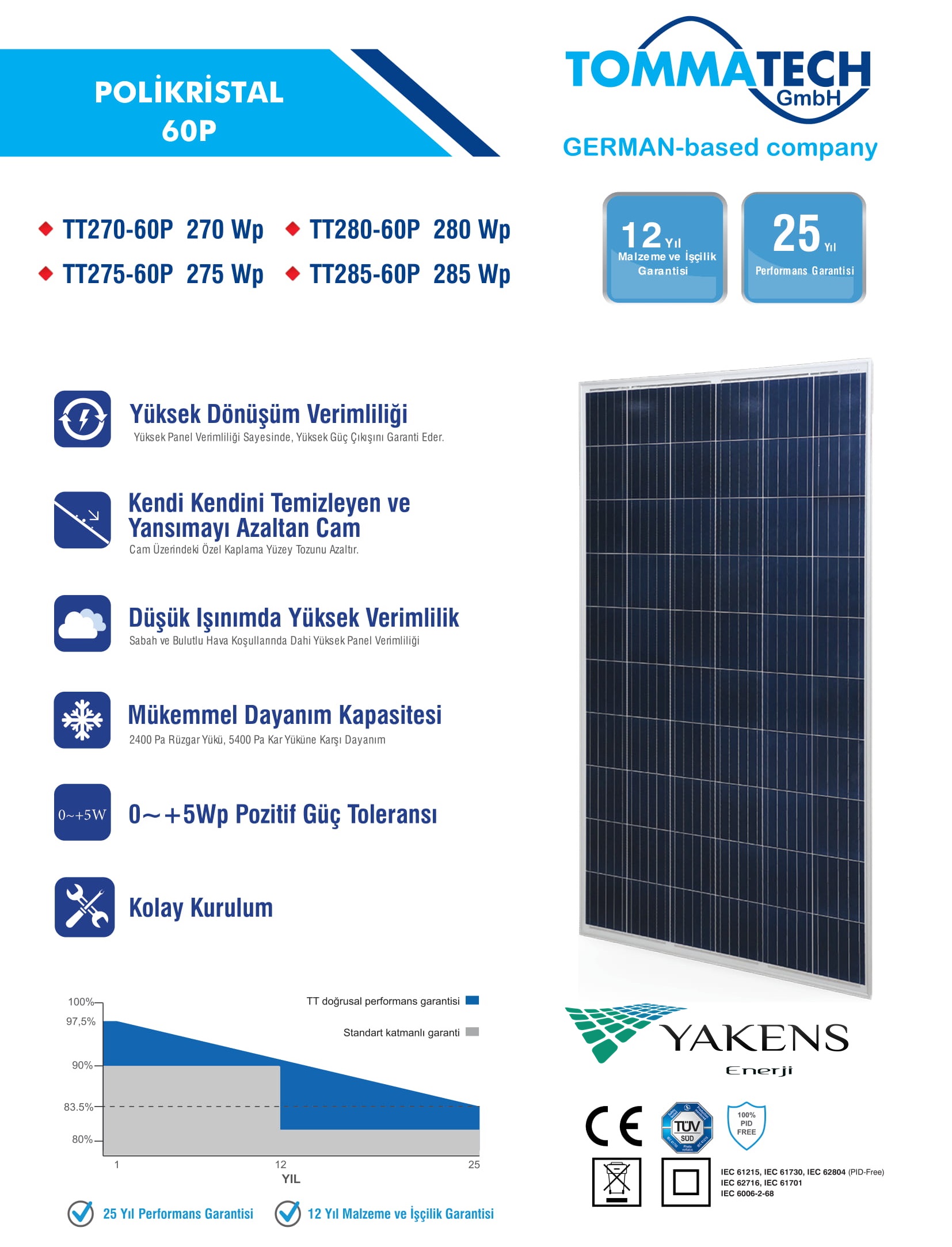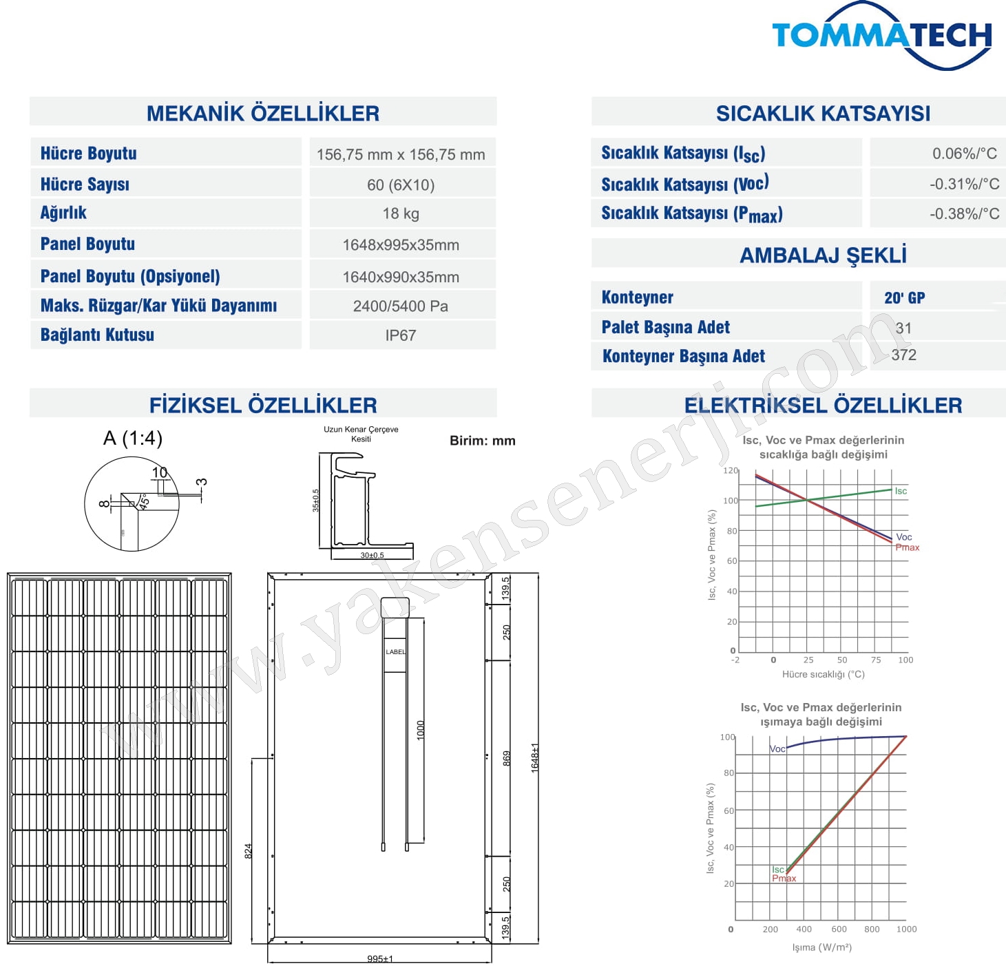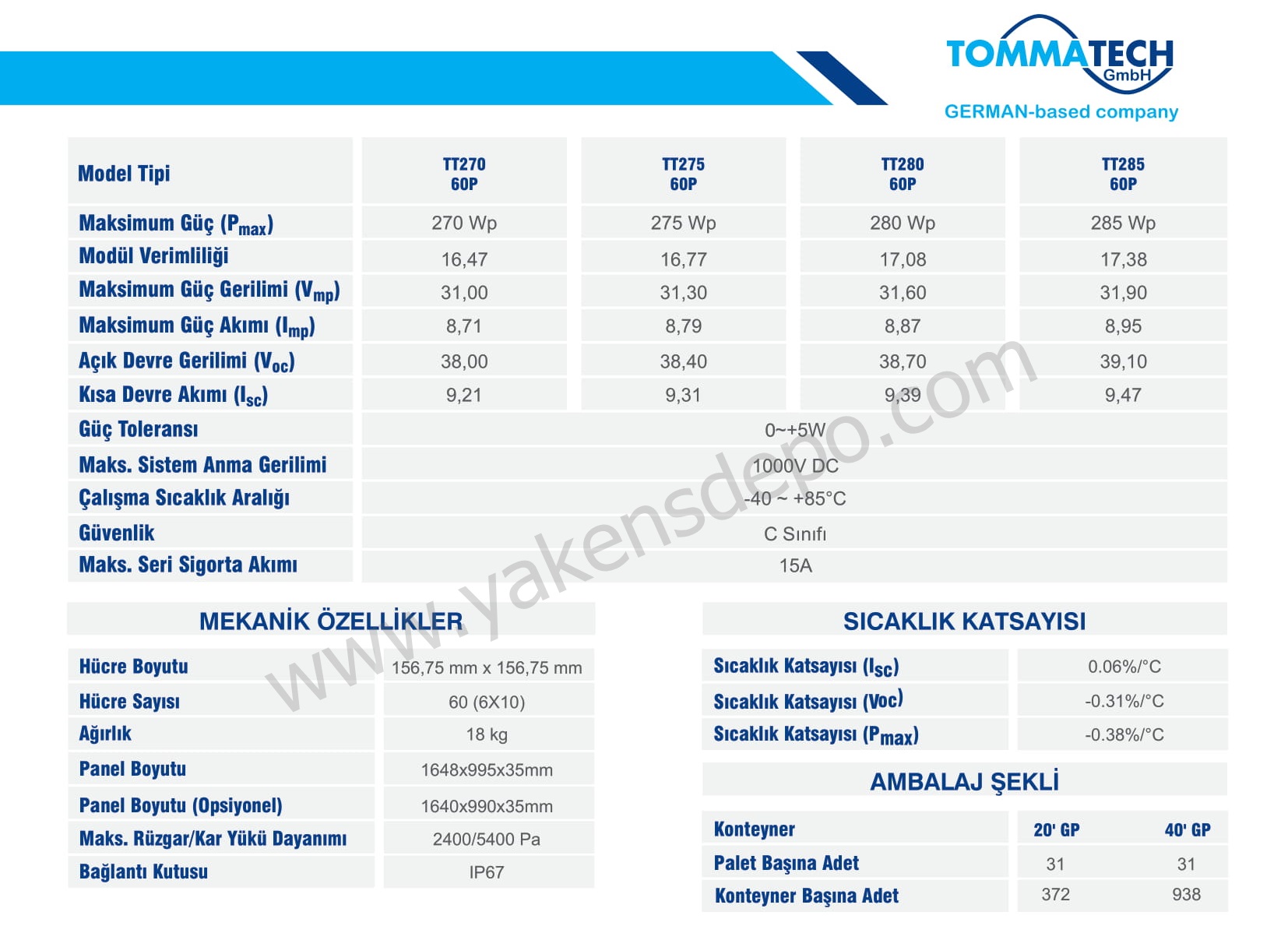 270 WATT TOMMATECH GÜNEŞ PANELİ TT270-60P TEKNİK ÖZELLİKLER